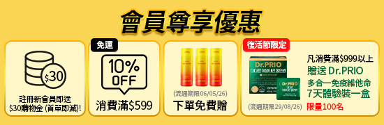 至2026-04-07T16:00:00.000+00:00截止 全店,[限量滿額贈] 消費滿$999, 贈送 Dr.Prio多合一免疫維他命 7天體驗裝(1盒)🎁(效期:29/08/2026) **限量100名**